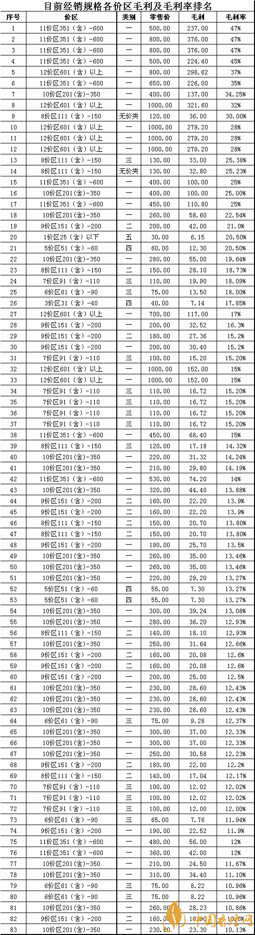 注:從目前全市經(jīng)銷的83個品牌批零差價可以看出,單品牌規(guī)格毛利率低于11%的僅有5個規(guī)格且全部高于10%的毛利率,部分溢價的規(guī)格產(chǎn)品毛利率已經(jīng)接近了50%,卷煙規(guī)格的平均毛利率達到了17.97%,然而這都預(yù)期的毛利,為什么真實的現(xiàn)狀是我們賺不到這應(yīng)該屬于我們自己的毛利率和毛利,是值得每一個卷煙經(jīng)營者深思和考慮的問題?為了保障大家的合法利益我們隱藏了商品名稱和商品編碼,有經(jīng)驗的零售客戶對照價區(qū)和商品獲利水平就可以清晰的對商品進行定位,具體對應(yīng)商品規(guī)格請參照2019版《卷煙零售客戶服務(wù)手冊》卷煙價格一覽表有詳解。