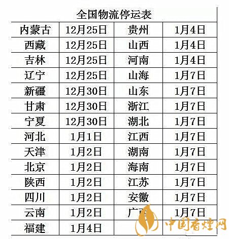 但今年的寒冷天氣侵襲嚴(yán)重,大風(fēng)降溫影響顯著,加之重污染天氣預(yù)警較為頻繁的影響,以及2019年大部分地區(qū)的初雪也都來(lái)得比較早,物流問(wèn)題面臨著嚴(yán)重的考驗(yàn),因此不少地區(qū)的物流公司的假期也提前了,全國(guó)物流停運(yùn)時(shí)間已經(jīng)確定。