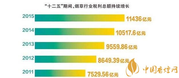 就“十二五”期間,煙草行業(yè)稅利占國家財政收入的比重保持平穩(wěn),始終保持在7.2%~7.5%的較高水平。五年上繳財政總額4.13萬億元,年均增長17.5%,比同期全國財政收入年均增長率高4.7個百分點。2015年,在經(jīng)濟下行壓力持續(xù)加大的情況下,煙草行業(yè)為國家財政增收做出了更大貢獻(xiàn),充分體現(xiàn)了國家財政收入“蓄水池”的功能。
