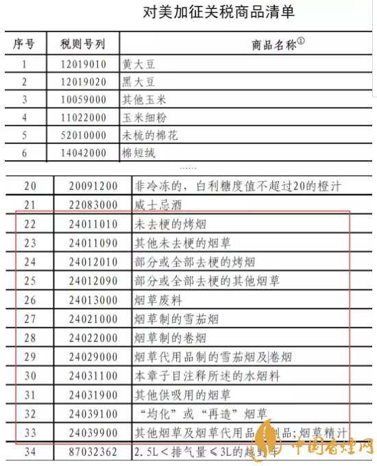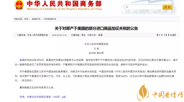 隨著中美貿(mào)易戰(zhàn)的不斷升級(jí),從受限清單的第一頁(yè),煙民們酒看到了煙草生產(chǎn)過(guò)程中涉及的未去??緹?、其他去梗煙草、煙草制的雪茄煙、煙草制的卷煙等產(chǎn)品。為捍衛(wèi)中方自身合法權(quán)益,中國(guó)政府依據(jù)《中華人民共和國(guó)對(duì)外貿(mào)易法》等法律法規(guī)和國(guó)際法基本原則,對(duì)原產(chǎn)于美國(guó)的進(jìn)口商品對(duì)等采取加征關(guān)稅措施,稅率為25%,涉及2017年中國(guó)自美國(guó)進(jìn)口金額約500億美元。