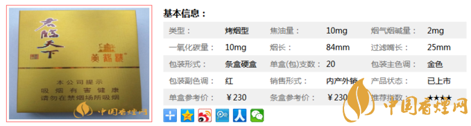 | 類型 :烤煙型 | 焦油量 :10mg | 煙氣煙堿量 :2mg | 一氧化碳量 :10mg |
