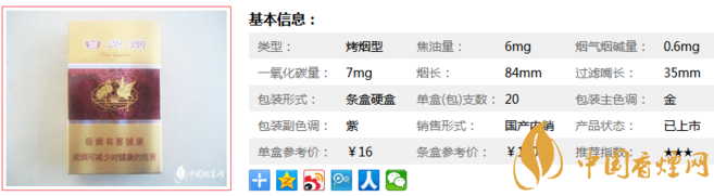 | 類型 :烤煙型 | 焦油量 :6mg | 煙氣煙堿量 :0.6mg | 一氧化碳量 :7mg |