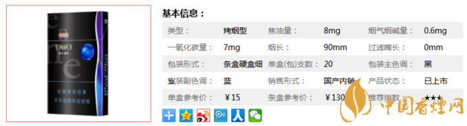 | 類型 :烤煙型 | 焦油量 :8mg | 煙氣煙堿量 :0.6mg | 一氧化碳量 :7mg |