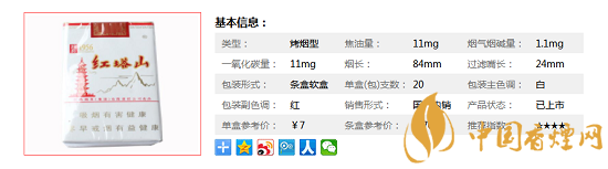 | 類型 :烤煙型 | 焦油量 :11mg | 煙氣煙堿量 :1.1mg | 一氧化碳量 :11mg |