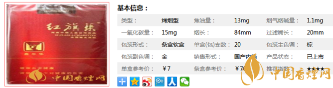 | 類型 :烤煙型 | 焦油量 :13mg | 煙氣煙堿量 :1.1mg | 一氧化碳量 :15mg |