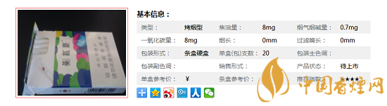 | 類(lèi)型 :烤煙型 | 焦油量 :8mg | 煙氣煙堿量 :0.7mg | 一氧化碳量 :8mg |