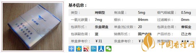 | 類型 :烤煙型 | 焦油量 :5mg | 煙氣煙堿量 :0.5mg | 一氧化碳量 :7mg |