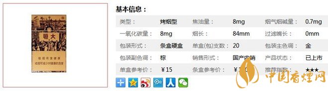 | 類型 :烤煙型 | 焦油量 :8mg | 煙氣煙堿量 :0.7mg | 一氧化碳量 :8mg |