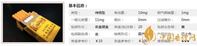 | 類型 :烤煙型 | 焦油量 :10mg | 煙氣煙堿量 :1mg | 一氧化碳量 :11mg |