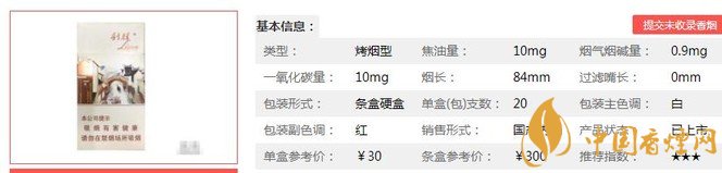 | 類型 :烤煙型 | 焦油量 :10mg | 煙氣煙堿量 :0.9mg | 一氧化碳量 :10mg |