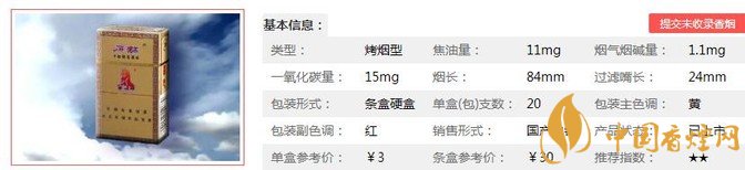 | 類型 :烤煙型 | 焦油量 :11mg | 煙氣煙堿量 :1.1mg | 一氧化碳量 :15mg |