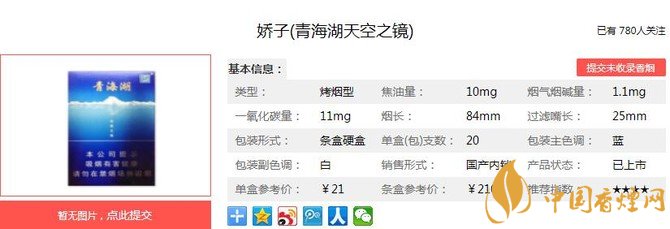 嬌子青海湖天空之鏡的包裝十分精致美觀,是一款令很多煙民因顏值而心動行動的香煙,但這款香煙地域性太強,以至于很多煙民都沒有見過。經(jīng)香煙網(wǎng)小編市場調(diào)查嬌子青海湖天空之鏡售價為21元/包。