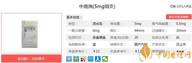 中南海5mg細(xì)支煙支長94mm,過濾嘴長:30mm,新型細(xì)支規(guī)格卷煙,采用激光打孔燙印水松紙、高透氣度成型紙和卷煙紙,有效降低焦油量等煙氣指標(biāo)。下面我們一起來看中南海5mg細(xì)支的參數(shù)信息:焦油量:5mg 煙堿量:0.5mg 一氧化碳量:6mg