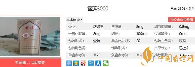 針對(duì)特色低焦油葉組配方品質(zhì)特征,通過(guò)高溫、高濕環(huán)境中使煙葉原料發(fā)生熱裂解、熱合成反應(yīng),達(dá)到改善煙草及煙草原料香氣質(zhì)、香氣量的目的,在保持產(chǎn)品香氣風(fēng)格和口味特征的基礎(chǔ)上,充分發(fā)揮煙葉原料潛質(zhì)和使用價(jià)值。經(jīng)香煙網(wǎng)小編市場(chǎng)調(diào)查雪蓮3000售價(jià)為20元/包。