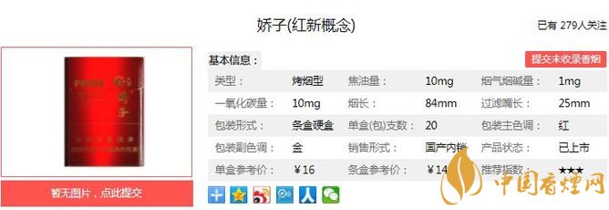 嬌子紅新概念煙支長(zhǎng)84mm,過濾嘴長(zhǎng)25mm,該產(chǎn)品在運(yùn)用傳統(tǒng)的葉組配方降焦技術(shù)和卷煙紙降焦技術(shù)的基礎(chǔ)上,成功地集成應(yīng)用了復(fù)合生化制劑減害材料這項(xiàng)具有川渝公司自主知識(shí)產(chǎn)權(quán)的核心減害技術(shù)。下面我們一起來看嬌子紅新概念的參數(shù)信息:焦油量:10mg 煙堿量:1.0mg 一氧化碳量:10mg