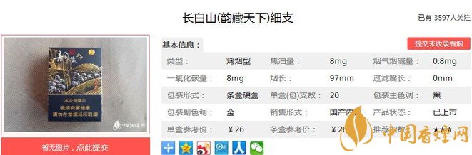 長白山韻藏天下細支煙支長97mm,專有的沉香活性成分制備技術及沉香載體柔性加工技術,保障了香氣釋放量的均勻一致,吸煙過程更輕松。下面我們一起來看長白山韻藏天下細支的參數(shù)信息:焦油量:8mg 煙堿量:0.8mg 一氧化碳量:8mg