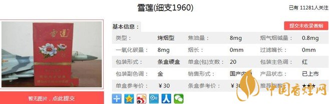 “雪蓮(細(xì)支1960) ”取名寓意為紀(jì)念新煙于1960年建廠,煙葉選料精良,突出煙草本香,增加抽吸的層次感和豐富性。雪蓮(細(xì)支1960)新品以過硬的質(zhì)量水平,3月份在新疆卷煙廠完成封箱工作,標(biāo)志該牌號(hào)卷煙正式落地新煙。經(jīng)香煙網(wǎng)小編市場調(diào)查雪蓮細(xì)支1960售價(jià)為30元/包。