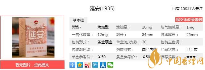 延安(1935)煙支長:84mm,烤煙型,包裝形式:條盒硬盒(每盒 20 支,每條 10 盒)。以“有延安更有精神”為核心理念設計出的一款香煙,以延安的烽火激情大時代為背景,詮釋延安品牌的文化傳承。下面我們一起來看延安(1935)的參數(shù)信息:焦油量:10mg 煙堿量:1.0mg 一氧化碳量:12mg