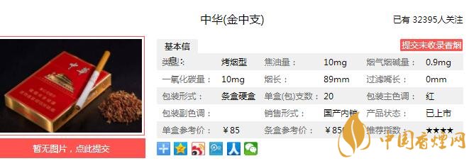 中華金中支煙支長(zhǎng)84mm,20毫米的煙支圓周對(duì)比細(xì)支煙煙氣更濃郁、香氣更豐富、煙香更純正、滿足感更強(qiáng),切絲采用精益加工,定制生產(chǎn)了0.8mm寬度的煙絲,輔以低流量柔性處理的烘絲工藝,最大限度保留煙草本香。下面我們一起來看中華金中支的參數(shù)信息:焦油量:10mg 煙堿量:0.9mg 一氧化碳量:10mg