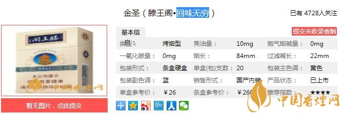 以上便是由香煙網(wǎng)小編為大家介紹的關于金圣(滕王閣·回味無窮)多少錢一包 回味無窮口感及參數(shù)介紹的相關信息,想要了解更多有關內容請點擊:阿里山香煙好抽嗎 六款阿里山香煙口感分析
