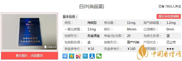 以上便是由香煙網(wǎng)小編為大家介紹的關(guān)于白沙尚品藍(lán)多少錢一包 白沙尚品藍(lán)口感及參數(shù)介紹的相關(guān)信息,想要了解更多有關(guān)內(nèi)容請(qǐng)點(diǎn)擊:好貓金絲猴大圣歸來香煙價(jià)格 好貓大圣歸來口感分析