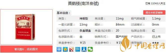 黃鶴樓(南洋叁號(hào))整個(gè)煙盒比較復(fù)古,后面經(jīng)典的人物商標(biāo),作為一個(gè)煙民就算不看煙的名字看到后面的封面也知道這一定是黃鶴樓了,側(cè)面是煙的數(shù)值,焦油11可算是中規(guī)中矩了。下面便是黃鶴樓(南洋叁號(hào))的基本參數(shù):焦油量:11mg 煙堿量:1.1mg 一氧化碳量:13mg.