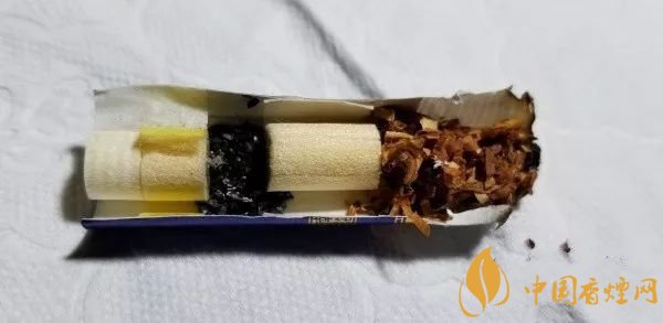 剖開濾嘴,連活性炭段,濾嘴是四段。最外側(cè)是一段中空硬化濾嘴,這個技術(shù)來源于BAT,目前國內(nèi)很多煙廠在其中高端款型上都有采用。從活性炭段前后的絲束段顏色來看,稍稍淺黃,顏色均勻,煙氣的流速和空氣導(dǎo)入效果不錯,活性炭的過濾和穩(wěn)流作用不錯。