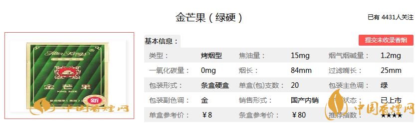 以上就是香煙網(wǎng)小編為大家整理介紹的關(guān)于金芒果綠硬多少錢一包?金芒果綠硬香煙價(jià)格和圖片的相關(guān)內(nèi)容。金芒果香煙曾經(jīng)風(fēng)靡全國(guó),如今已慢慢淡出市場(chǎng),實(shí)在是可惜啊。想了解更多下個(gè)月信息,請(qǐng)關(guān)注香煙網(wǎng)!