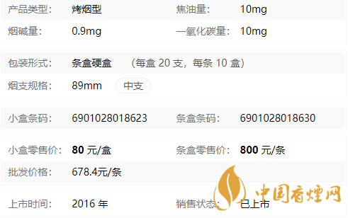 | 類型 :烤煙型 | 焦油量 :10mg | 煙氣煙堿量 :0.9mg | 一氧化碳量 :10mg |
