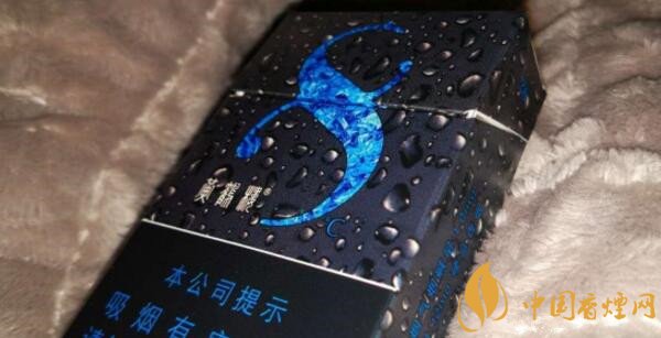 這款香煙正面外觀來看給人的第一印象它就是一款涼煙,炫酷純黑的底色搭配晶亮水滴為主色調(diào),同時冰藍(lán)顏色的抽象冰塊圖案形成了一個數(shù)字“8”形狀,讓人覺得涼爽的同時也突出了產(chǎn)品LOGO。