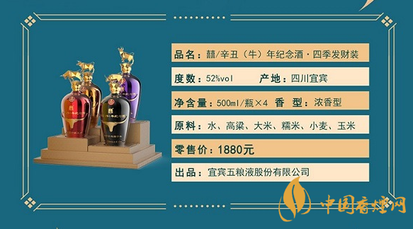 五糧液辛丑(牛)年紀(jì)念酒.四季發(fā)財裝,瓶蓋 頂立如牛,切割金屬牛以金屬材質(zhì)潛心鑄造四種靈敏聚財?shù)慕鹋P螒B(tài)!瓶身 金牛頭,采用浮雕工藝,將牛年傳統(tǒng)生肖結(jié)合,鴻運(yùn)當(dāng)頭照,宜賓五糧液有限公司:囍酒!瓶底 電鍍工藝質(zhì)感,細(xì)致浮雕防滑!五糧液辛丑(牛)年紀(jì)念酒.四季發(fā)財裝京東售價1880元。