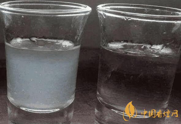 將酒倒入杯中,然后兌水,如果是純糧酒,則會(huì)出現(xiàn)失光、渾濁的現(xiàn)象,這是因?yàn)榧Z食酒中有些物質(zhì)不溶于水,只溶于酒,加水后度數(shù)下降,水增多,這些物質(zhì)就會(huì)析出,導(dǎo)致酒液渾濁;如果是酒精酒,則不會(huì)出現(xiàn)這種現(xiàn)象。