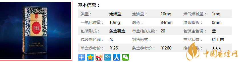 | 煙長(zhǎng):84mm | 過(guò)濾嘴長(zhǎng):25mm | 包裝形式:盒裝 | 單盒(包)支數(shù):20 |