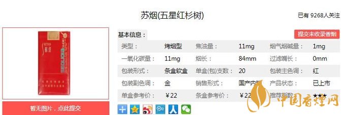 蘇煙五星紅杉樹產(chǎn)品包裝大膽采用全版電化鋁印刷技術(shù)及橫向的純字體裝飾,外觀設(shè)計簡約大方、時代感強,喜慶、大方,與“蘇煙”系列產(chǎn)品風(fēng)格一脈相。經(jīng)香煙網(wǎng)小編市場調(diào)查蘇煙五星紅杉樹售價為22元/包。