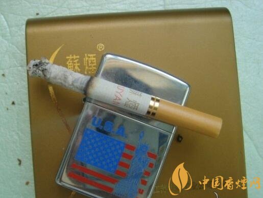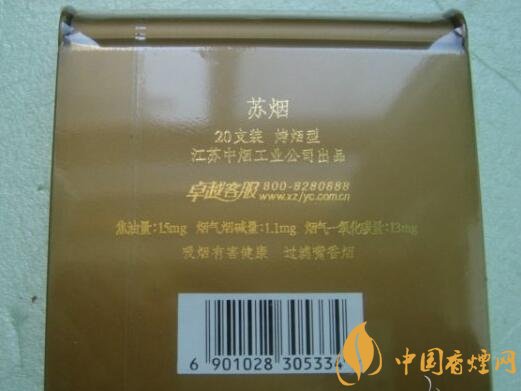 暗金色塑盒包裝,主體為方形,上下兩側(cè)作弧形處理,給人以輕巧圓潤之感。正面左側(cè)一道極似女人身體曲線的“S”形劃過,旁邊有繁寫的“蘇煙”二字,右下方是“江蘇中煙工業(yè)公司出品”,設計簡約,表意婉約。背面標有商品的基本信息(包括三項理化指標、條形碼等)和警示語。其余四面皆無文字或圖案。