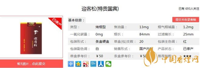 利群夜西湖煙支長84mm,過濾嘴長25mm,煙支的設(shè)計(jì)簡潔大方,金色的品名迎客松與YINGKESONG被一條金箍相隔,白色豎紋盤紙包裹的煙支修長挺拔。下面我們一起來看迎客松特貢國賓的參數(shù)信息:焦油量:13mg 煙堿量:1.2mg 一氧化碳量:12mg