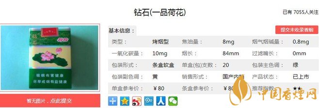 鉆石一品荷花于2014年上市,在高端卷煙市場(chǎng)占用很大的份額,濃淡適中的香氣,勁頭適中成為很多人的口糧。清雅脫俗的包裝設(shè)計(jì)更讓人愛(ài)不釋手,經(jīng)香煙網(wǎng)小編市場(chǎng)調(diào)查鉆石一品荷花售價(jià)為80元/包。