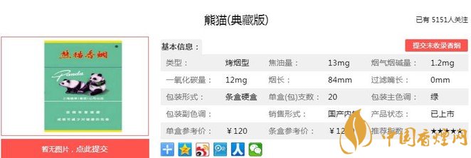 熊貓(典藏版)煙支長(zhǎng)84mm,過濾嘴長(zhǎng)30mm,金色“熊貓”、藍(lán)色“Panda”的字樣印在橫紋卷煙紙上,導(dǎo)致煙條段的視覺效果很短。煙絲為純?nèi)~絲,無(wú)填料,金黃油潤(rùn),柔軟整齊,品質(zhì)上乘。下面我們一起來(lái)看熊貓(典藏版)的參數(shù)信息:焦油量:13mg 煙堿量:1.2mg 一氧化碳量:12mg