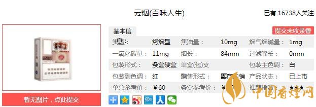 云煙百味人生優(yōu)選世界香料,取典型天然香韻,提取爆珠,賦予獨特香味風格吸味,與本香完美融合。選擇捏爆爆珠,感受爆珠香氣與煙草本香完美融合帶來的獨特的風格吸味,煙味醇厚,豐富甜潤,領尚五味。經(jīng)香煙網(wǎng)小編市場調(diào)查云煙百味人生售價為60元/包。
