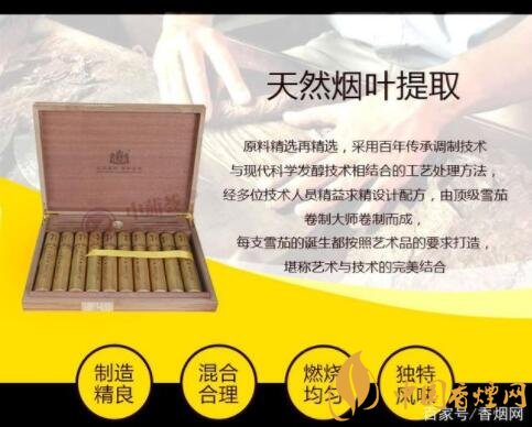 口感:全葉卷片煙純手工雪茄;香氣純正、豐滿,吸味順?biāo)?。微微的辛辣感,以煙葉原味為主線,融合交錯(cuò),勁頭適中,味道均衡。不沖不淡,十分適合初嘗雪茄的雪茄客。