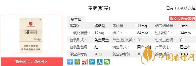貴煙(新貴)是貴州中煙升級(jí)傳統(tǒng)卷煙配方,以創(chuàng)新柔性配方工藝,將技術(shù)創(chuàng)新與精致美感完美結(jié)合、精心打造的全新產(chǎn)品;貴煙(新貴)以精選的原料、精致的工藝、精純的口感,簡(jiǎn)潔、明快的產(chǎn)品風(fēng)格,演繹完美的新貴“精致”生活。經(jīng)香煙網(wǎng)小編市場(chǎng)調(diào)查貴煙新貴售價(jià)為11元/包。