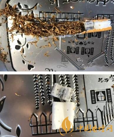 出于好奇,把其中的一根進(jìn)行了分尸??梢钥吹接袃啥芜^濾嘴,一段加了活性炭,一段就是普通的過濾嘴。