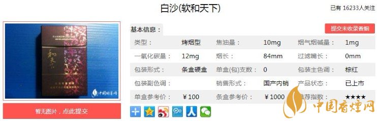 “白沙(軟和天下)在吸味、香氣與刺激性上的協(xié)調(diào)完美;煙嘴仍然采用了圓形鏤空煙嘴,長度37mm,樣式與硬和也是基本一樣,只是多出來一道金環(huán)?;緟?shù)如下:焦油量:10mg