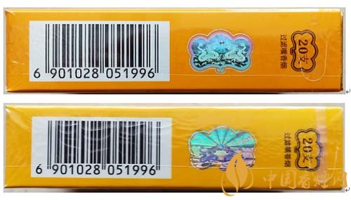 假冒卷煙:該款假冒卷煙花紋圖案燙金色彩暗淡,線條浮在商標(biāo)紙上。如圖上真下假