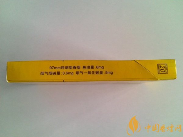 右側(cè)為詳細的商品信息,97mm烤煙型香煙,三項理化指標相對均衡:焦油量6mg 煙氣煙堿量0.6mg 煙氣一氧化碳量5mg。