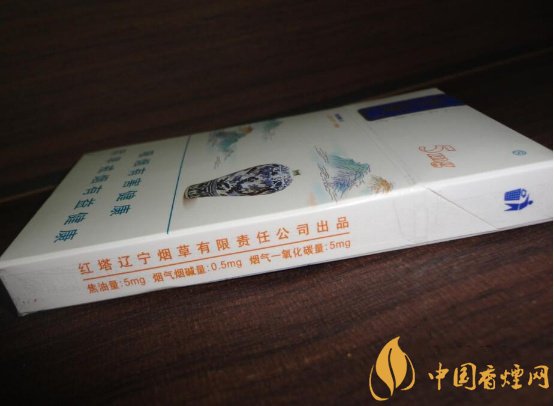 煙盒的右側注明了理化數(shù)值,紅塔遼寧煙草有限責任公司出品方名稱,焦油量:5mg、煙氣煙堿量:0.5mg、煙氣一氧化碳量:5mg,還印有顯眼的深藍色環(huán)保標識。