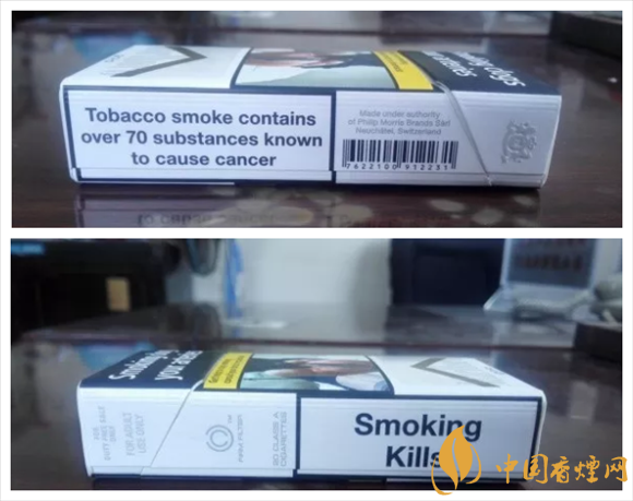 警示圖片的內(nèi)容,與84S紅或白等相同。從樣式上可以看出,它也是一款新版萬寶路。與84S系列相同的,是因?yàn)樽屛挥诰緢D片,黑框警示英文字句,轉(zhuǎn)而移到煙盒的左右側(cè)面。#p#副標(biāo)題#e#