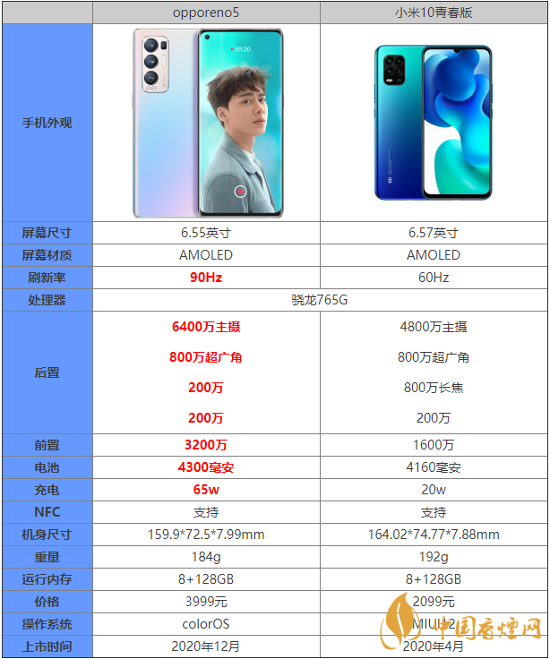 opporeno5和小米10青春版都是搭載驍龍765G的手機(jī),那么這兩款手機(jī)的之間的區(qū)別是什么呢?哪款手機(jī)更值得入手?接下來(lái)香煙網(wǎng)小編為大家?guī)?lái)最新的opporeno5和小米10青春版參數(shù)對(duì)比,感興趣的朋友快來(lái)看看吧。