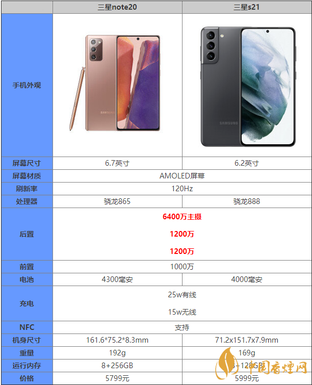 三星s21和三星note20哪款手機(jī)更好?許多朋友對(duì)這兩款手機(jī)都十分關(guān)注,那么這兩款手機(jī)的區(qū)別是什么?有什么不同之處?哪款手機(jī)更值得入手?接下來(lái)香煙網(wǎng)小編為大家?guī)?lái)三星s21和三星note20的參數(shù)對(duì)比,感興趣的朋友快來(lái)看看吧。