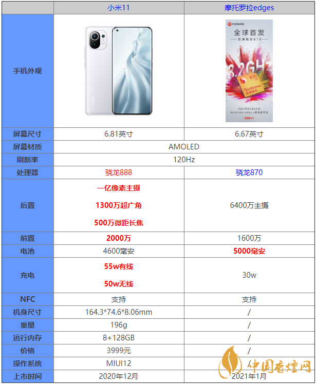 摩托羅拉edges是摩托羅拉即將發(fā)布的新款智能手機,那么這款手機和小米11的區(qū)別是什么?哪款手機更值得入手?許多小伙伴對此都十分好奇,接下來香煙網(wǎng)小編為大家?guī)碜钚碌哪ν辛_拉edges和小米11參數(shù)對比,快來看看吧。